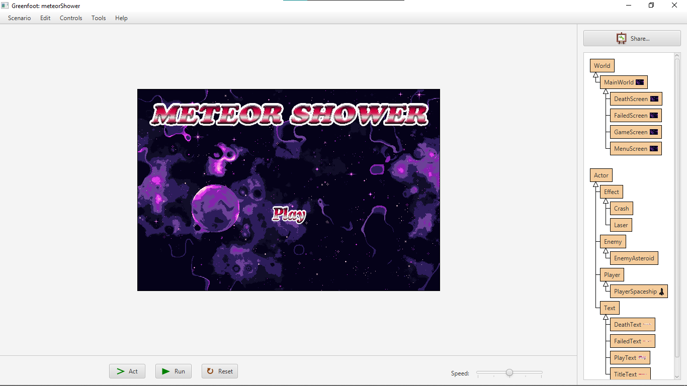 This game was a project for the Object-Oriented Programming, where we were assigned to create a game using Java with Greenfoot. Meteor Shower is a retro-style arcade game where the player controls a spaceship defending Earth by shooting down incoming meteors. It's a fun way to apply OOP concepts like inheritance, polymorphism, and event handling in an engaging and visual way.